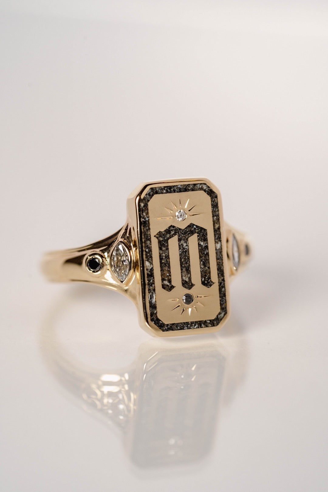A. We can work in 14kt and 18kt gold in the color of your choosing: yellow, white, or rose, and in special cases, platinum ruthenium. We can incorporate ashes, both cremated and aquamated, within your design. We can also work with hair and fur, though they'll need to be carefully prepared beforehand. We DO NOT work with teeth, breast milk, or any other body part or bodily fluid.